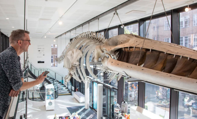 Bộ xương cá voi vây treo trên mái của bảo tàng. (Ảnh: Đại học Cambridge).