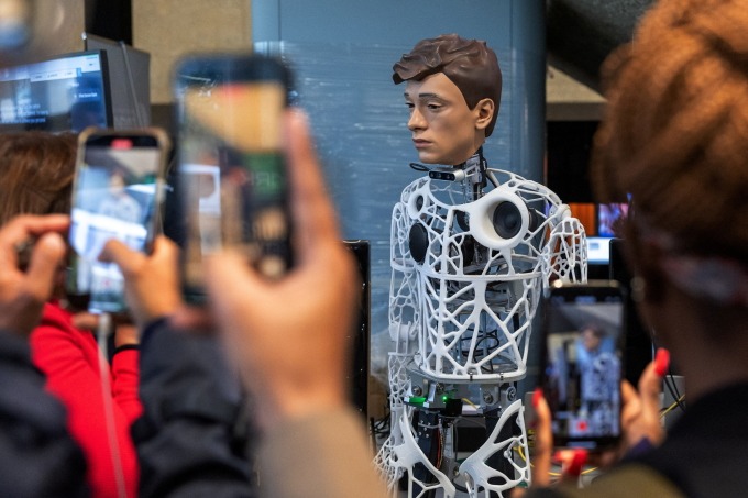 Captcha, robot của Hidoba Research, tại Hội nghị thượng đỉnh toàn cầu AI for Good do Liên minh Viễn thông Quốc tế (ITU) tổ chức tại Geneva, Thụy Sĩ, ngày 30/5/2024. Ảnh: Reuters