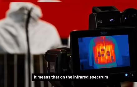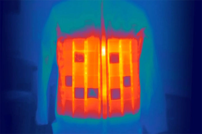 Chiếc áo tàng hình với vài mảnh đang được điều chỉnh để lạnh đi và tàng hình trước camera tầm nhiệt - (Ảnh cắt từ clip của Vollebak)