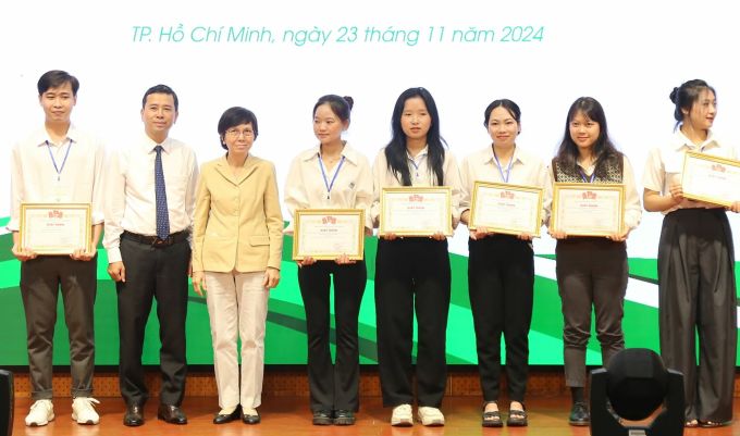Ban tổ chức trao giải nhất cuộc thi công nghệ chế biến sau thu hoạch năm 2024 cho hai nhóm tác giả Ảnh: BTC