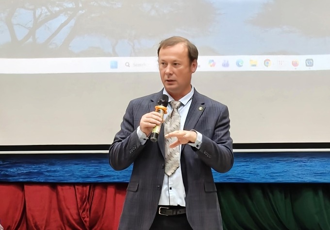 PGS.TS Renat Shakirov, trưởng đoàn khảo sát khoa học Nga, kể về chuyến đi của tàu nghiên cứu mang tên Viện sĩ M.A. Lavrientiev sáng 21/11. Ảnh: Trọng Đạt