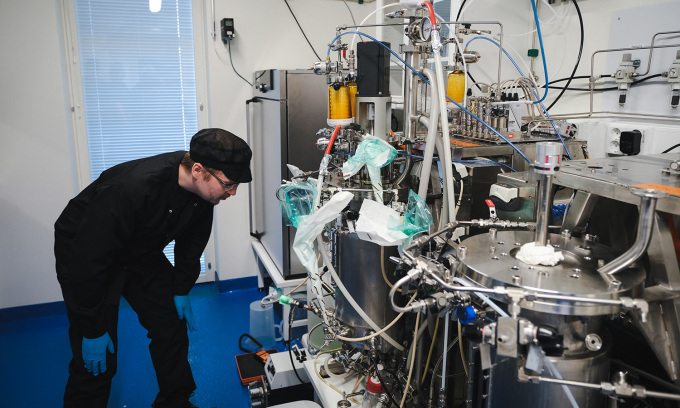 Kỹ thuật viên điều khiển quá trình phản ứng sinh học tại trụ sở công ty Solar Foods ở Vantaa, Phần Lan, ngày 2/5/2024. Ảnh: AFP