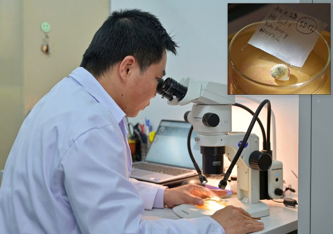 TS Đỗ Đức Sáng, Trường Đại học Khoa học Tự nhiên đang phân tích mẫu vật ốc. Ảnh: Nguyễn Thanh Sơn
