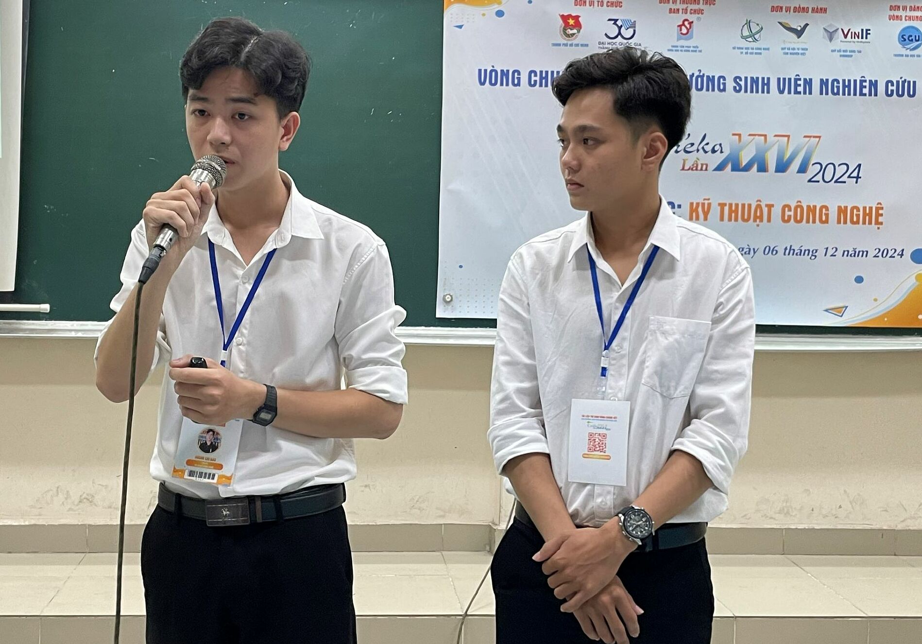 Dương Chí Bảo (trái) và Phạm Hoài Bảo giới thiệu máy tách vỏ hạt sen tại cuộc thi Sinh viên nghiên cứu khoa học Euréka ngày 6/12. Ảnh: Hà An
