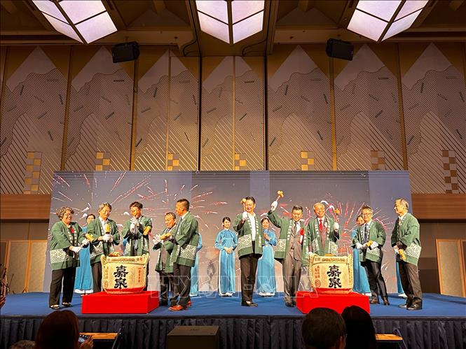 Chủ tịch Hội đồng quản trị Tập đoàn Công nghệ CMC Nguyễn Trung Chính cùng với khách mời thực hiện nghi thức đập rượu sake khai trương văn phòng thứ ba của CMC Japan tại Nhật Bản. Ảnh: Nguyễn Tuyến/TTXVN