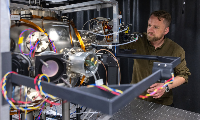 Tiến sĩ Joseph Cotter với hành lý dưới lòng đất của mình, gia tốc kế lượng tử dùng để điều hướng. Ảnh: Thomas Angus