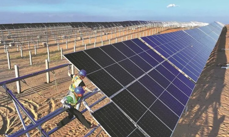 Công nhân lắp pin quang điện trên sa mạc Kubuqi. Ảnh: China Daily